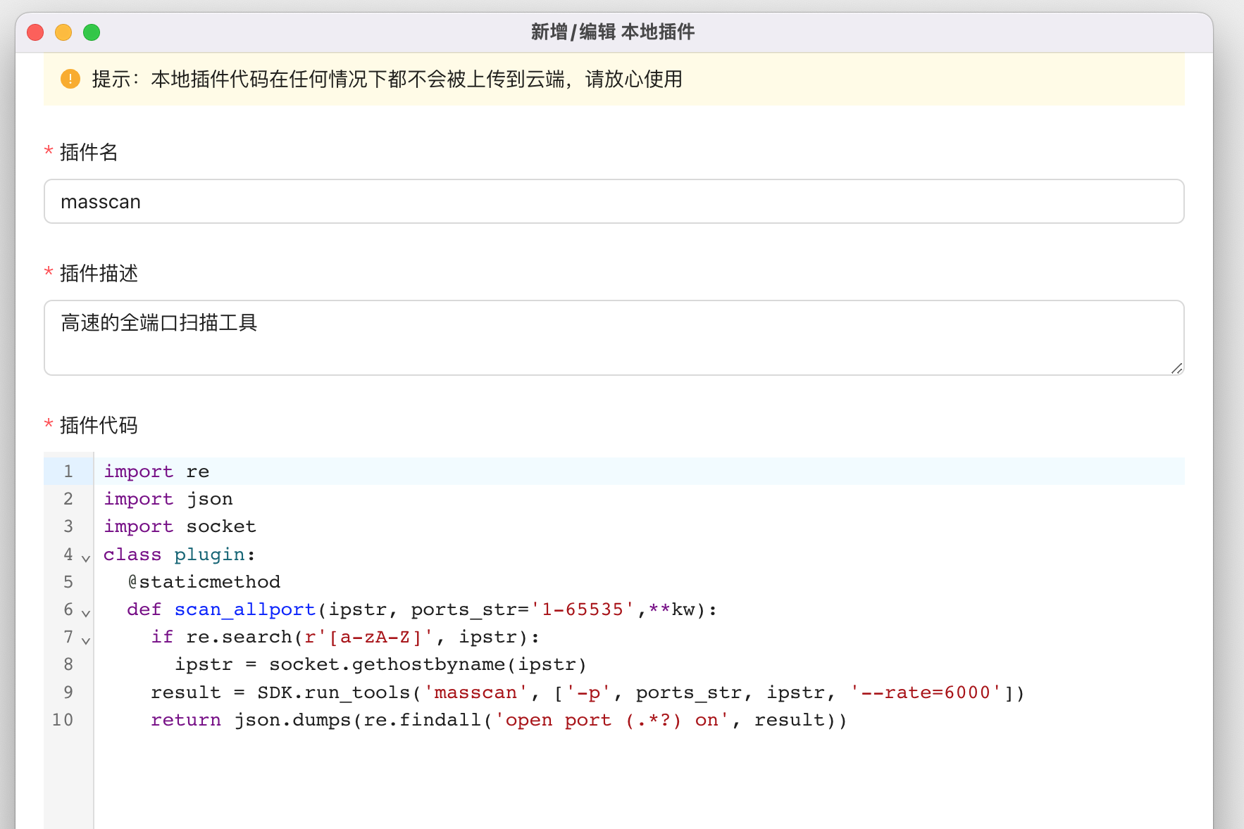 Taking the masscan plug-in as an example, the plug-in consists of the plug-in name, plug-in description, and plug-in code. The plug-in name and description can be defined according to the actual situation.